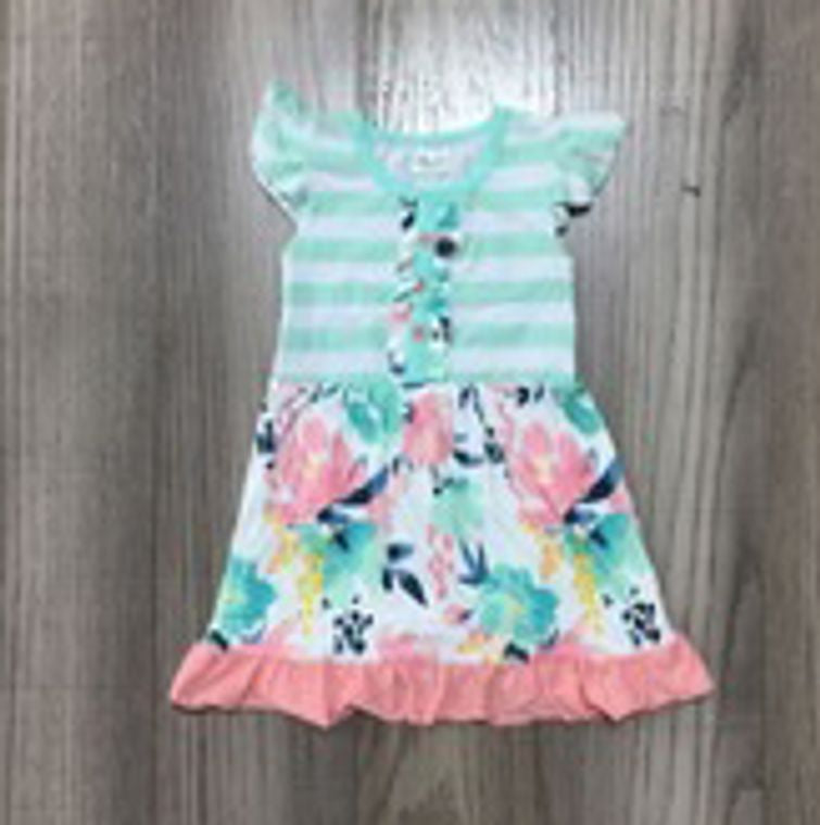 Spring Floral and Striped Dress. Blue and White Striped top with Angel sleeves. Tuxedo ruffle with pink buttons. Big Beautiful Spring Floral Skirt finished with a pink ruffle trim. Perfect for parties, Easter, Spring Holiday Events.