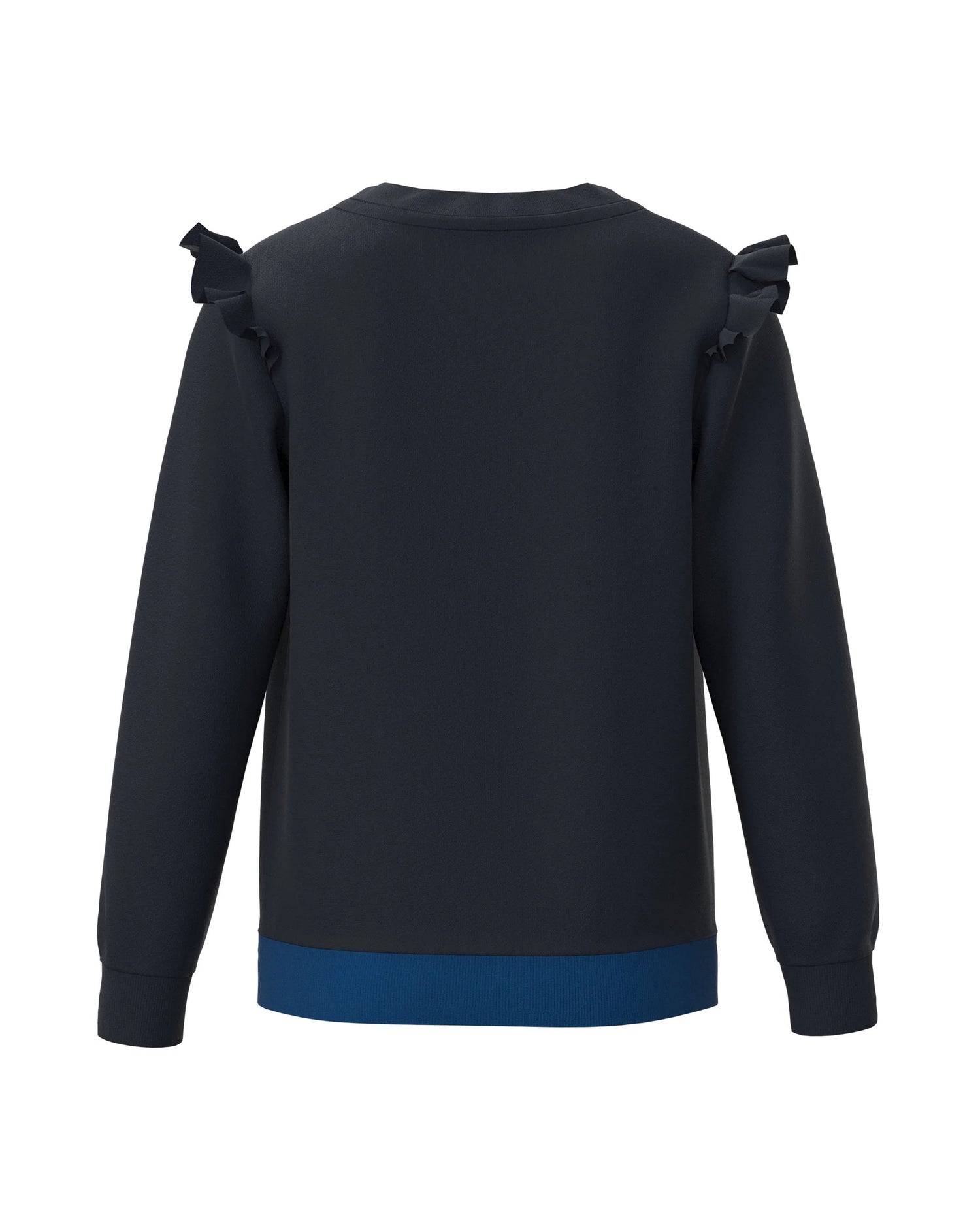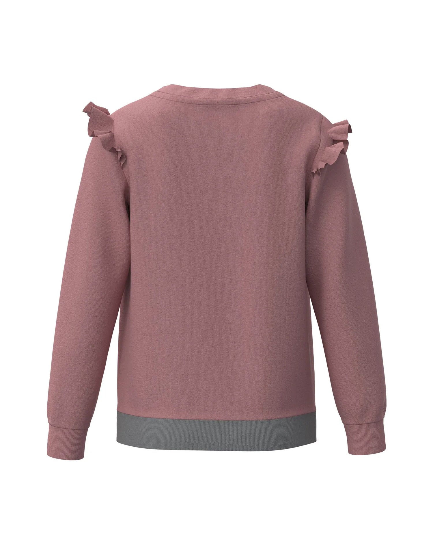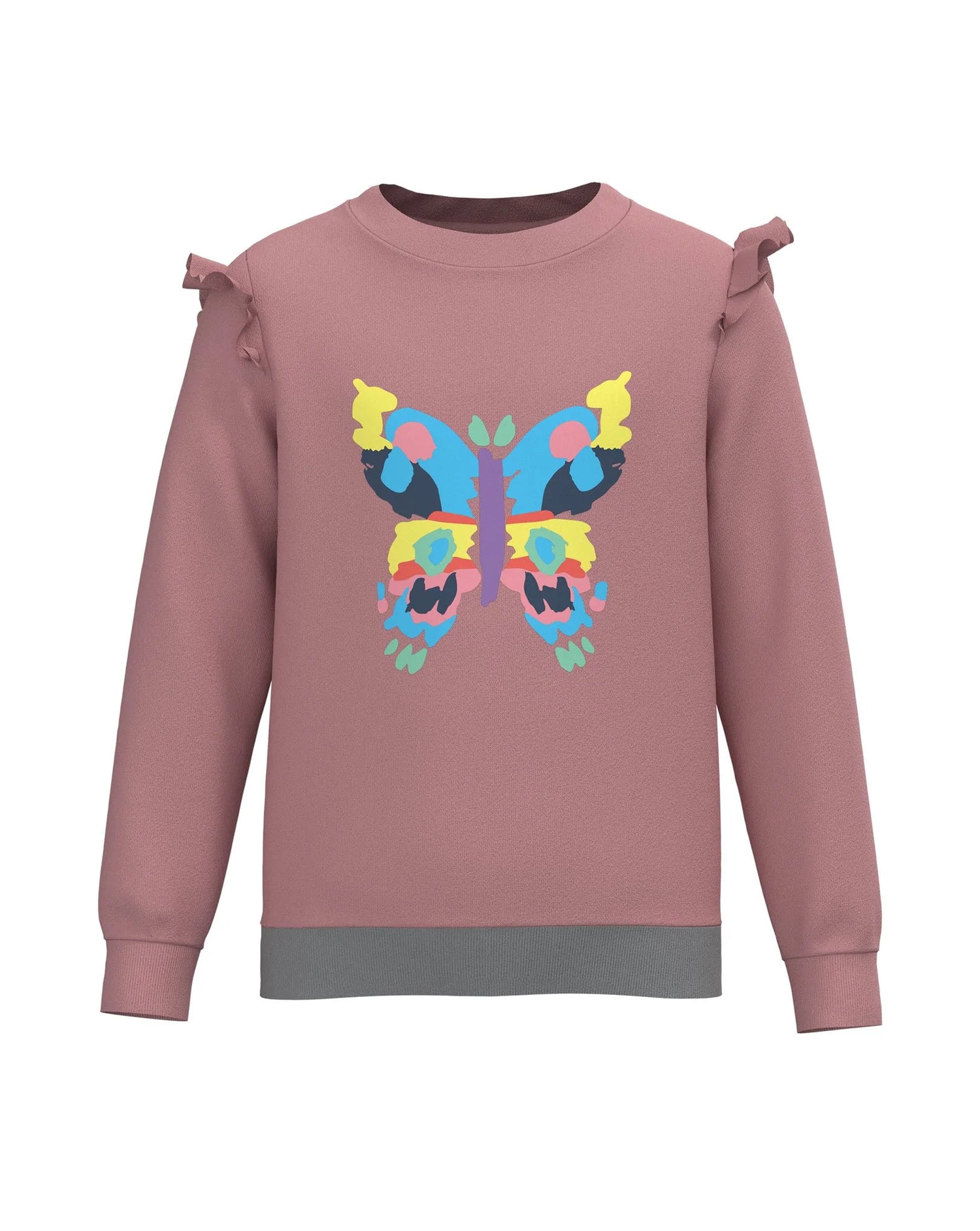 The gorgeous ruffle sweatshirt for girls is designed with a colorful butterfly graphic print and ribs.