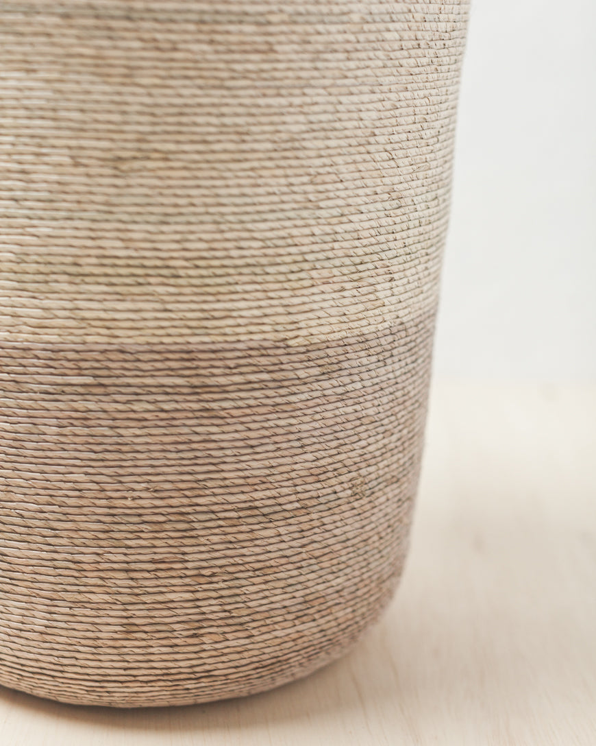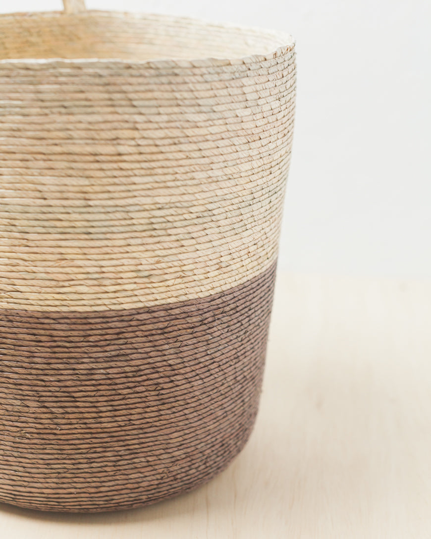Masterfully woven in Mexico from braided palm leaves, each of these baskets takes days to complete. Artisans carefully select the best palm leaves then dry and weave them using methods passed down through generations. This classic yet functional design pairs natural palm with a block of subtle earthy color.