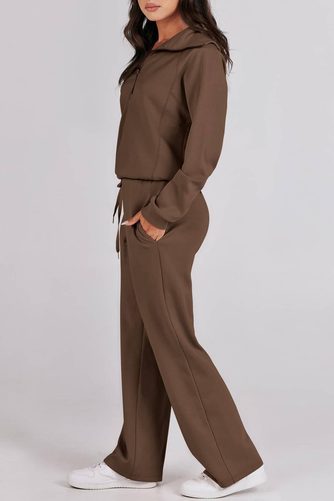 Rosa Clothing - Plain half zip drama collar sweatshirt wide leg pant set: Khaki / L