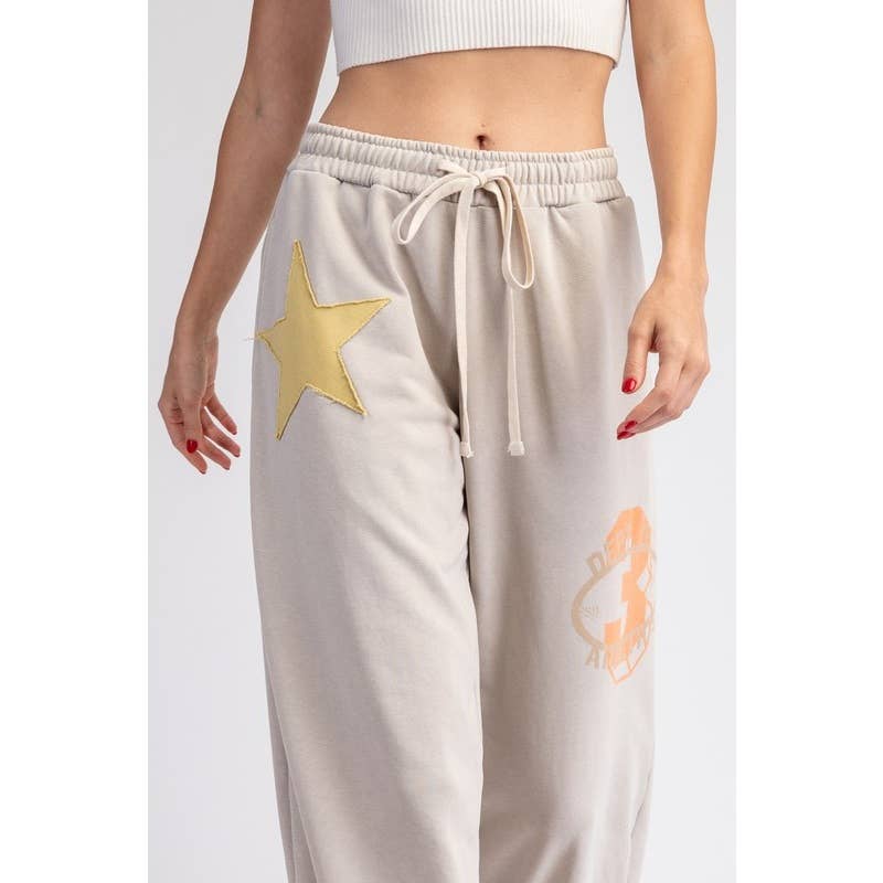 - Mineral washed jogger pants featuring print lettering and star patches for detail, an elastic waist with a pull drawstring, two side hip pockets, banded cuffs and is a relaxed fit.
