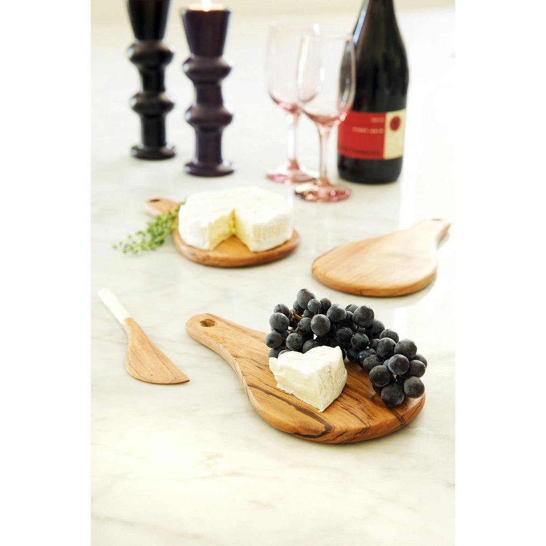 Our wild olive wood fromage trays are perfect for presenting gourmet cheeses. Hand carved from sustainably sourced wood by talented carvers in Kenya, each tray includes a hole for hanging. Because this item is handmade from a natural material, variations in grain and coloration are to be expected. Care instructions: Hand wash in warm soapy water, rinse and dry. Rub wood lightly with mineral or olive oil before storing. Dimensions: 8.5"L x 5"W x 0.25"H Crafted from: Wild olive wood